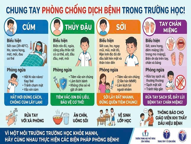 - Chào các bạn học sinh, các thầy cô giáo và các bậc phụ huynh! Trường học là ngôi nhà thứ hai, nơi chúng ta cùng học tập, vui chơi và phát triển. Tuy nhiên, môi trường tập thể đông người cũng là điều kiện thuận lợi cho nhiều loại dịch bệnh truyền nhiễm lây lan nhanh chóng. Để đảm bảo một môi trường học tập an toàn, khỏe mạnh, việc trang bị kiến thức về các bệnh thường gặp và cách phòng tránh là cực kỳ quan trọng.Hôm nay, chúng ta sẽ cùng tìm hiểu về 4 loại dịch bệnh phổ biến trong trường học: Cúm, Thủy Đậu, Sởi, và Tay Chân Miệng.
