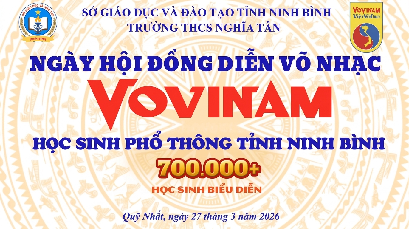 Hòa chung không khí sôi động của tuổi trẻ toàn tỉnh. Ngày 27 tháng 03 năm 2026 thầy và trò trường THCS Nghĩa Tân đã có một ngày hội đầy ý nghĩa và tự hào khi tham gia hưởng ứng “Ngày hội đồng diễn võ nhạc Vovinam học sinh phổ thông tỉnh Ninh Bình” do Sở Giáo dục và Đào tạo Ninh Bình tổ chức.