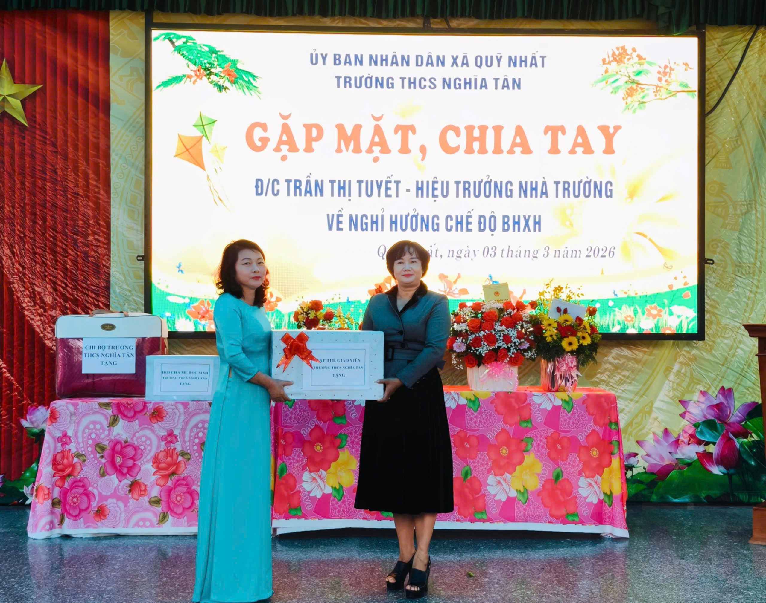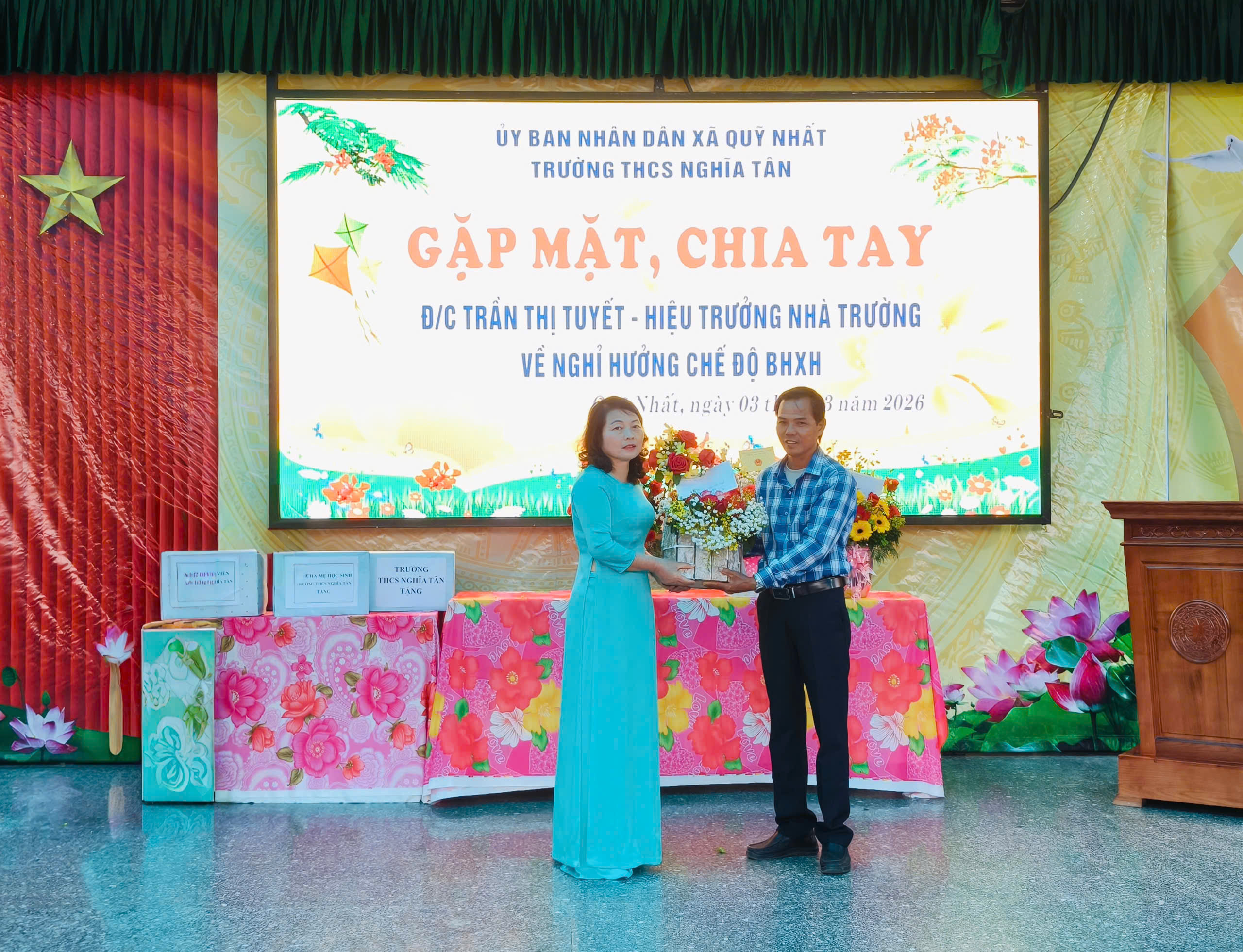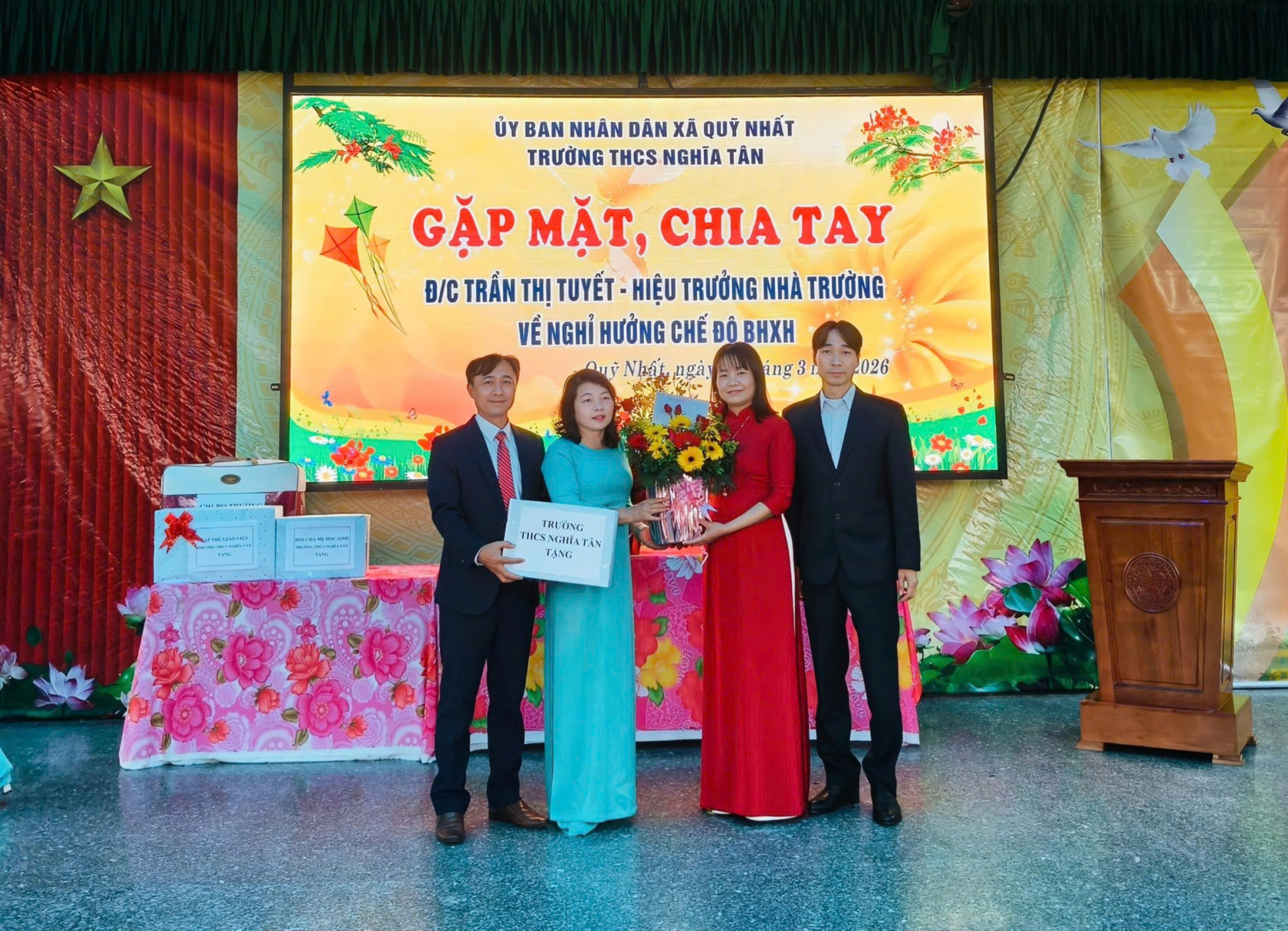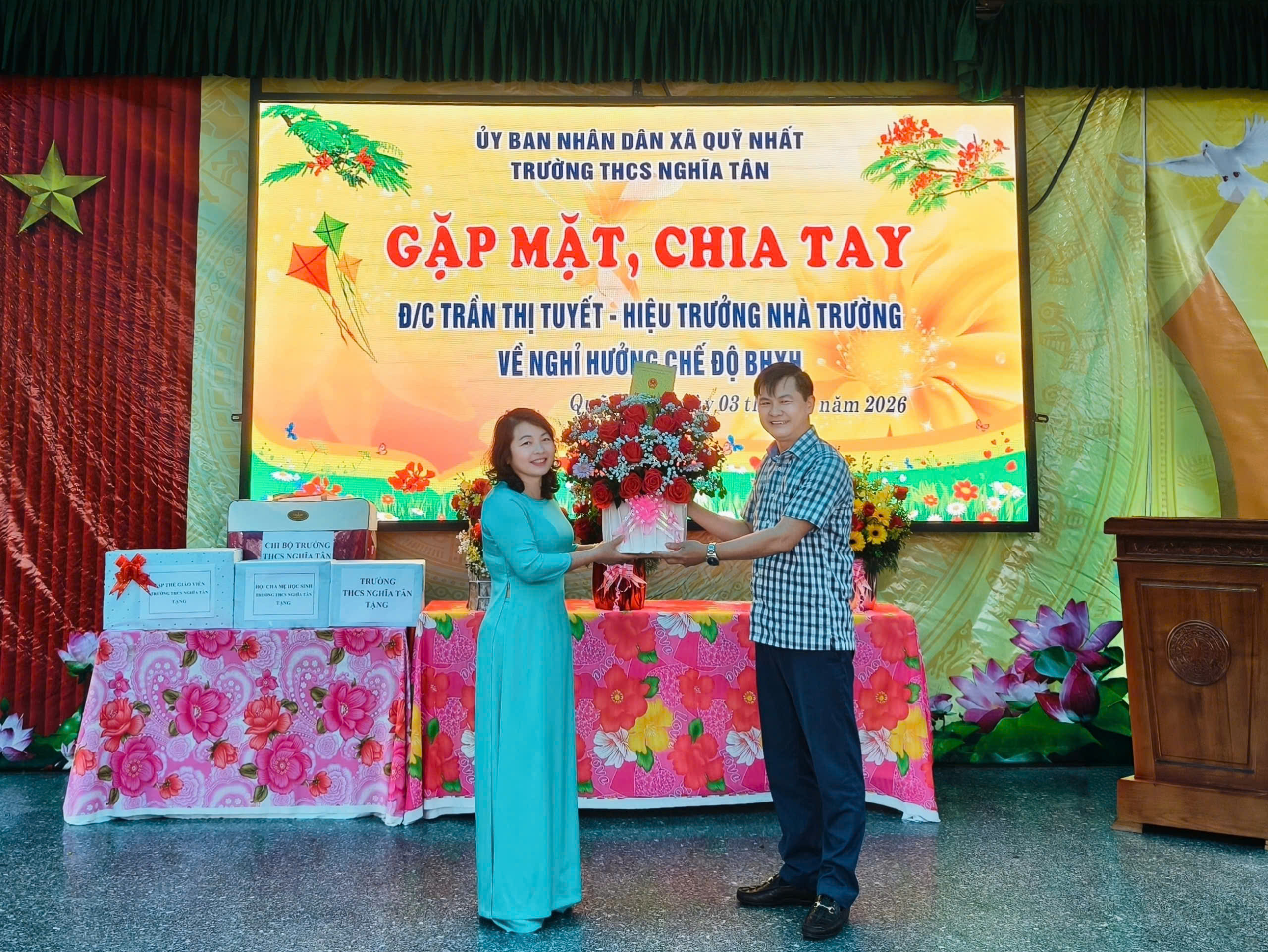 Ngày 03.3.2026, trong không khí trang trọng, đầm ấm và đầy lưu luyến, Trường THCS Nghĩa Tân đã tổ chức buổi gặp mặt, chia tay cô Trần Thị Tuyết – Hiệu trưởng nhà trường về nghỉ hưởng chế độ Bảo hiểm xã hội sau nhiều năm công tác và cống hiến cho sự nghiệp giáo dục.