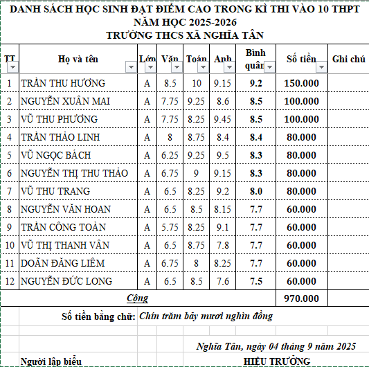Mở đầu buổi lễ, không khí trở nên đặc biệt tự hào khi nhà trường công bố những thành tích ấn tượng mà các em đã đạt được. Nổi bật trong số 12 gương mặt xuất sắc là em Trần Thu Hương, học sinh lớp 9A, đã xuất sắc trở thành thủ khoa của trường THPT B Nghĩa Hưng với số điểm gần như tuyệt đối: Văn 8.5, Anh 9.15 và đặc biệt là điểm 10 môn Toán. Thành tích của Hương không chỉ là niềm vinh dự của cá nhân em và gia đình mà còn là niềm tự hào to lớn của thầy và trò trường THCS Nghĩa Tân.